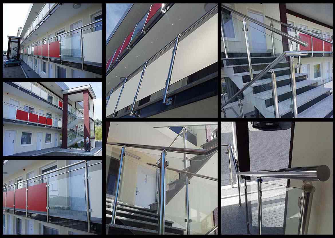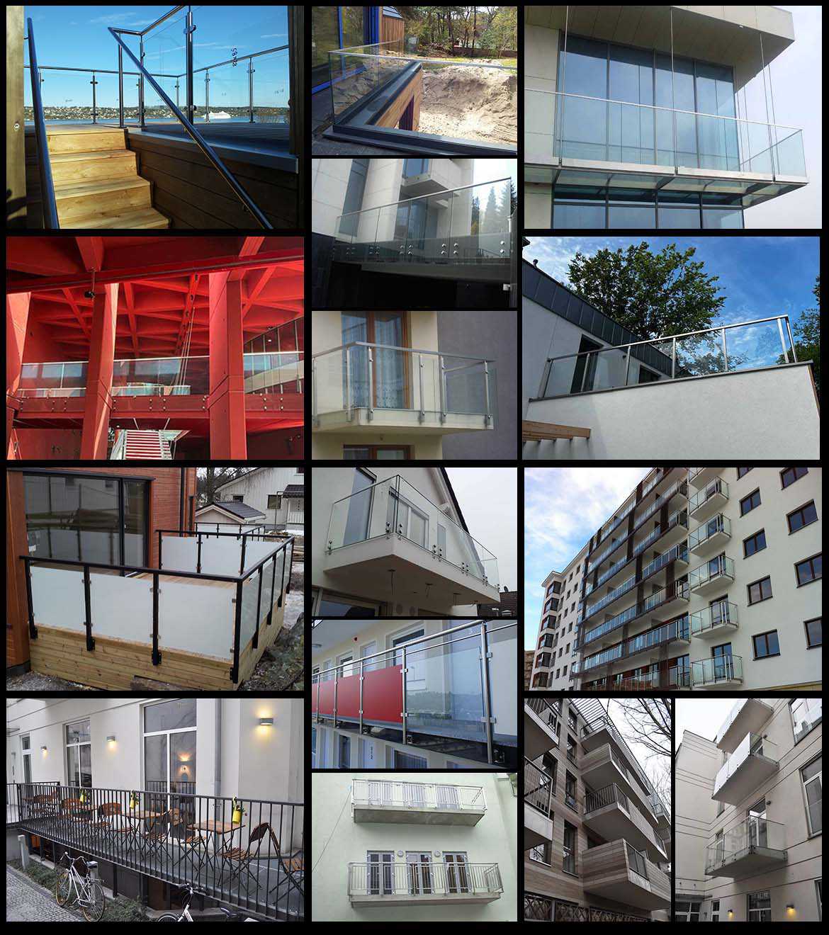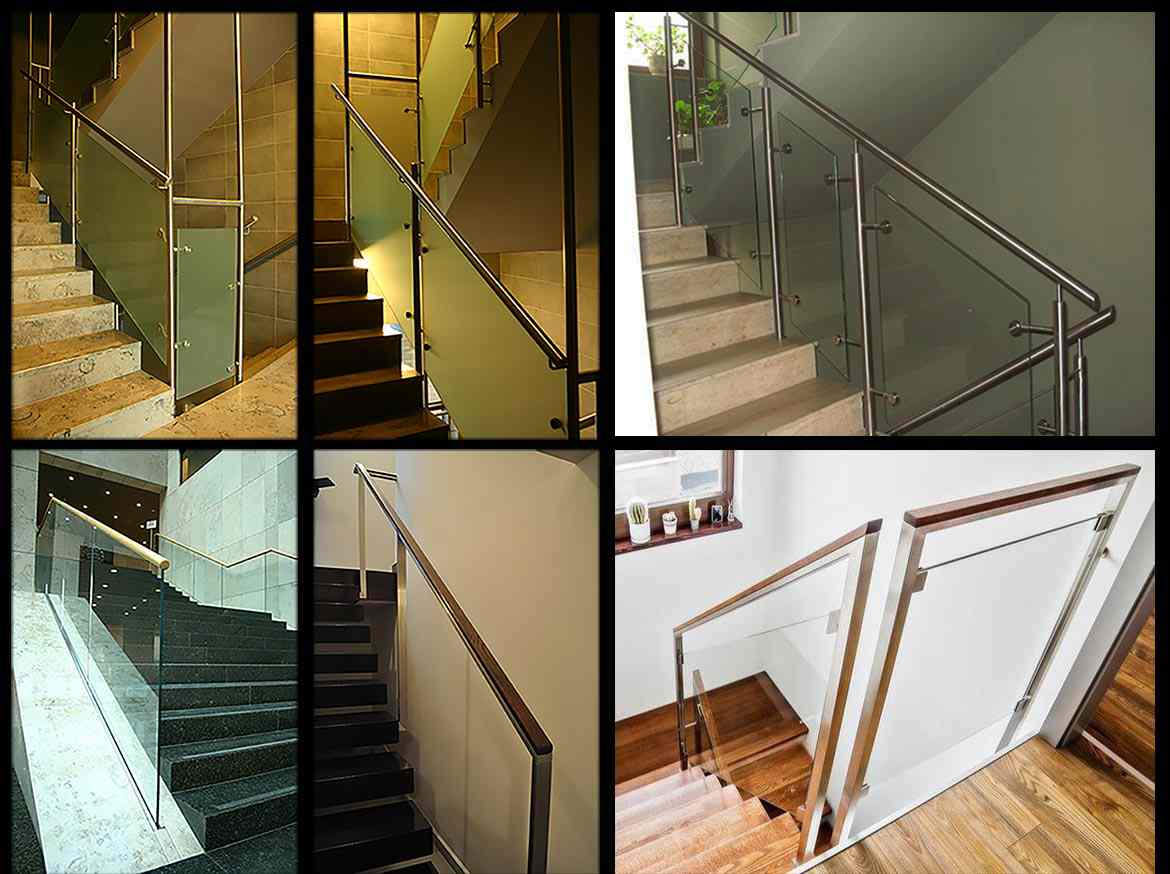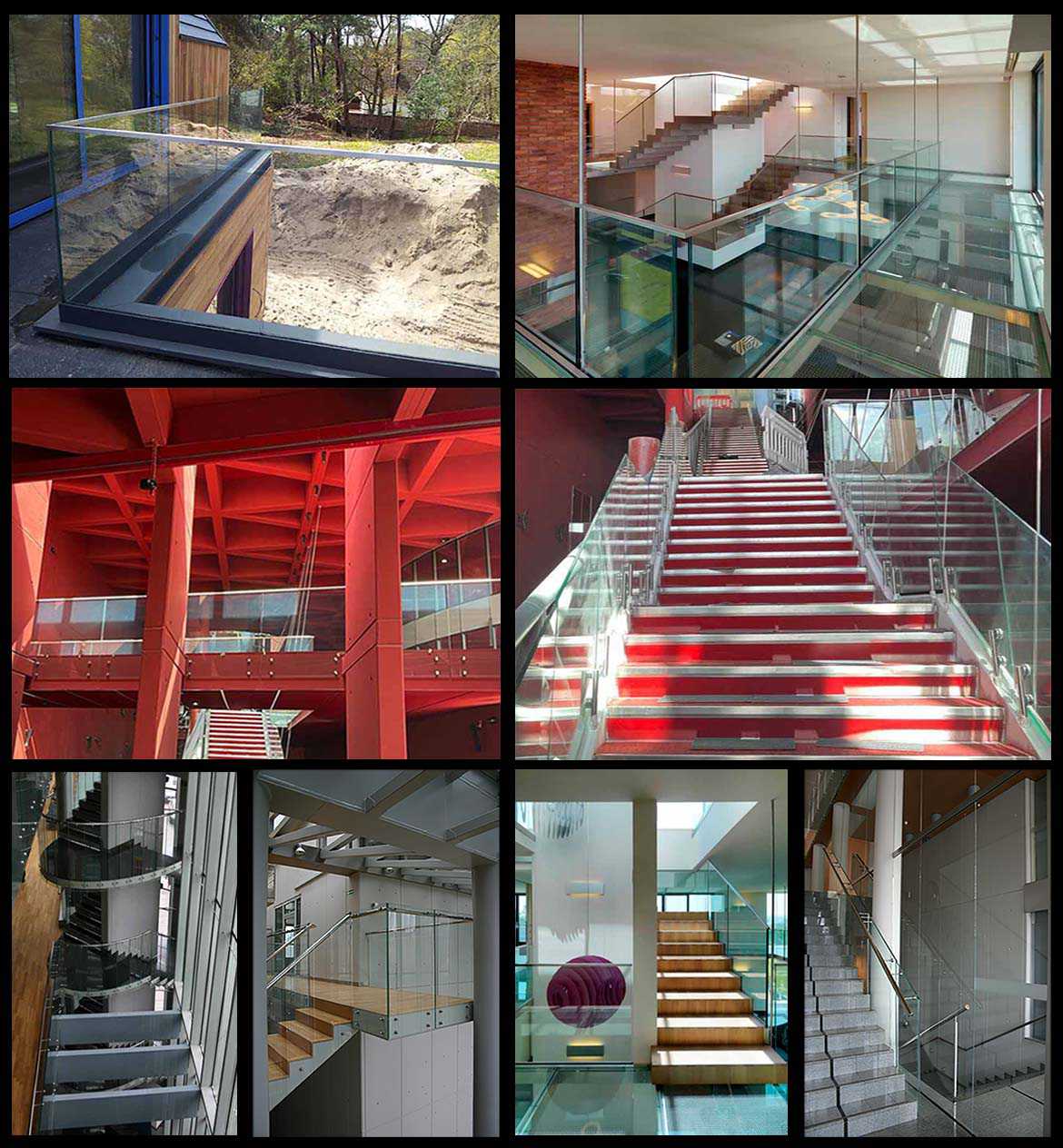Solutions presented are all-glass (frameless glass) together with another material, such as steel, aluminum or wood, for handrail.